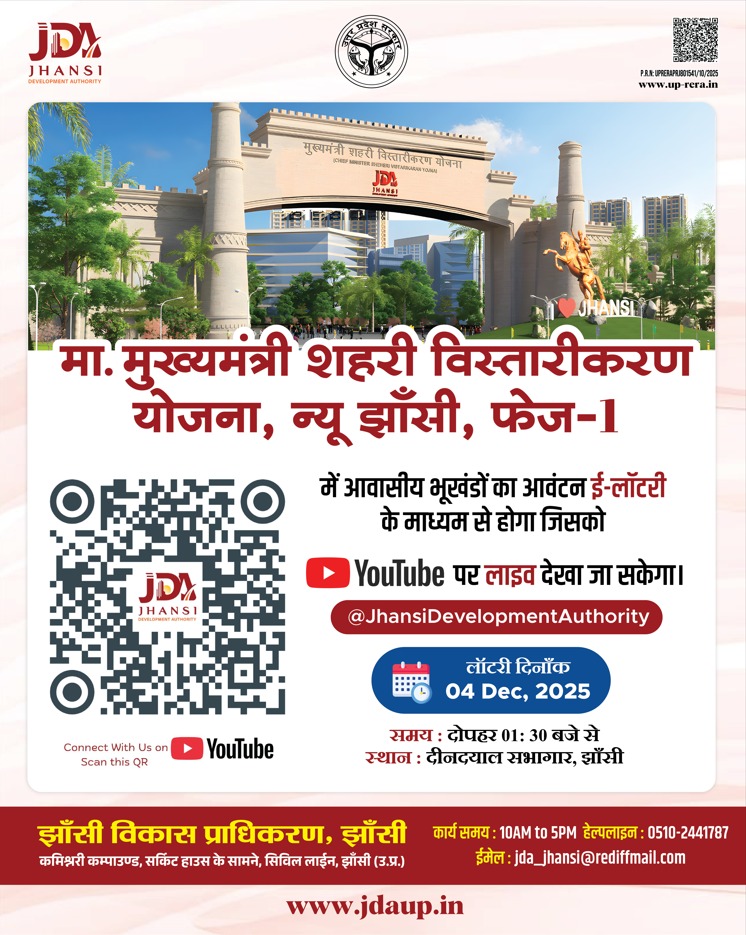 Jhansi Development Authority (JDA) is the principal agency of the Government of Uttar Pradesh responsible for taking ahead the tradition of planned and sustainable development of Jhansi. Jhansi Development Authority is responsible for preparation and implementation of master plan for the city. It takes up infrastructural and basic amenity development for Jhansi besides environment conservation and development of rural areas around the mother city. The aims and objectives of JDA are far reaching both in their short term and long term planning. The JDA plans to reduce population congestion is primary objective. A plan to have restricted individuals per hectare has been proposed.